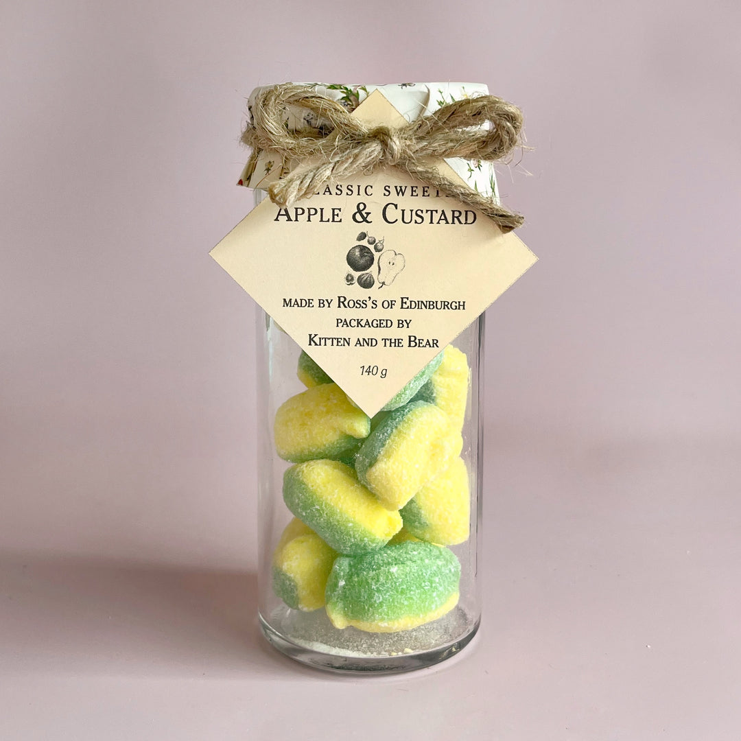 Description: Classic humbugs - a traditional hard boiled sweet - in a nostalgic green apple & custard flavour.