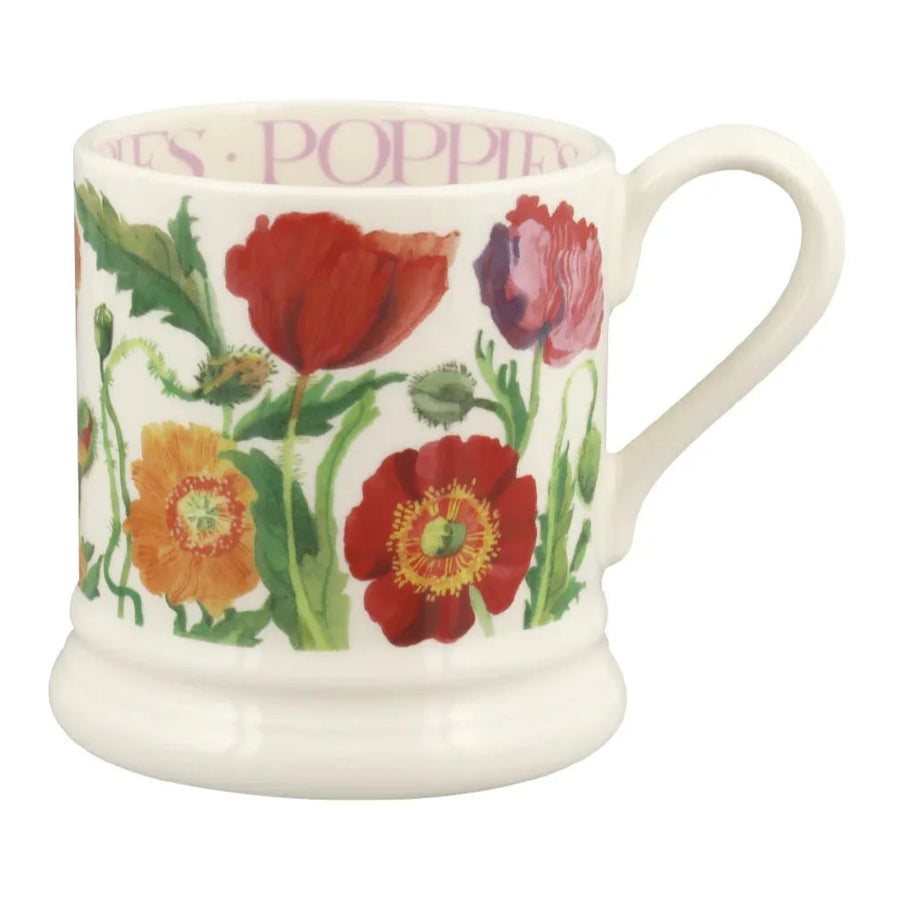 Description: Classic 1/2 pint mug, made in English earthenware and painted with vibrant poppies and with pink text on the interior lip.