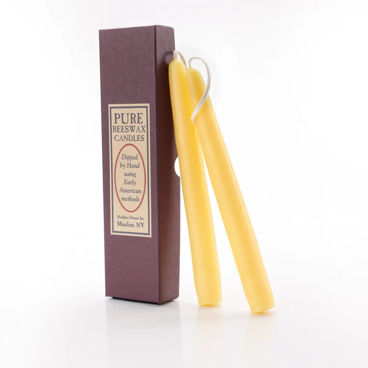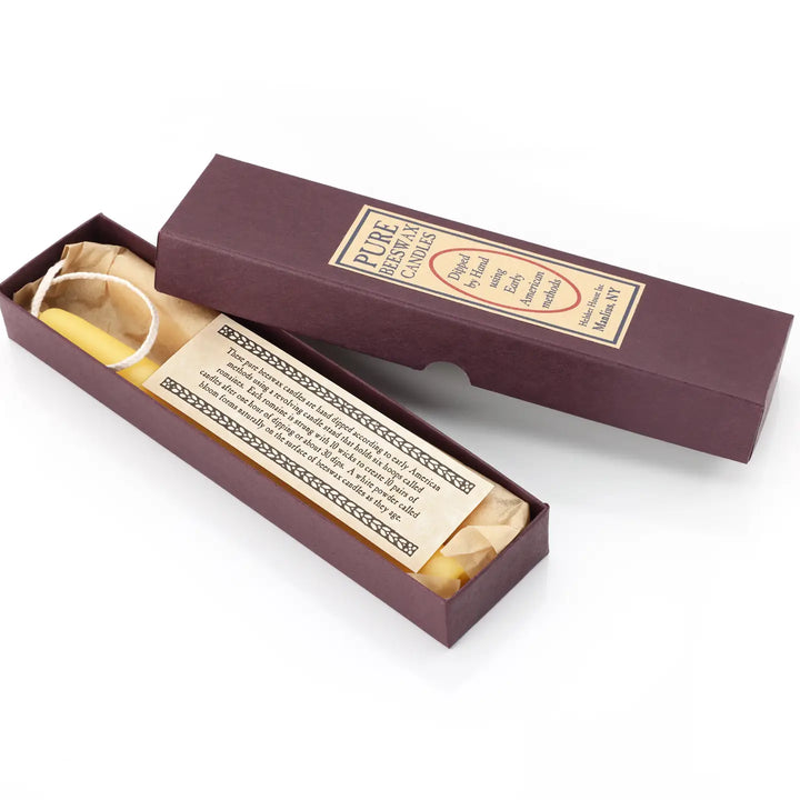 1 pair 8" real beeswax taper candles that are hand dipped on a circa 1850 candle carousel, beautifully presented in a gift box with information card
