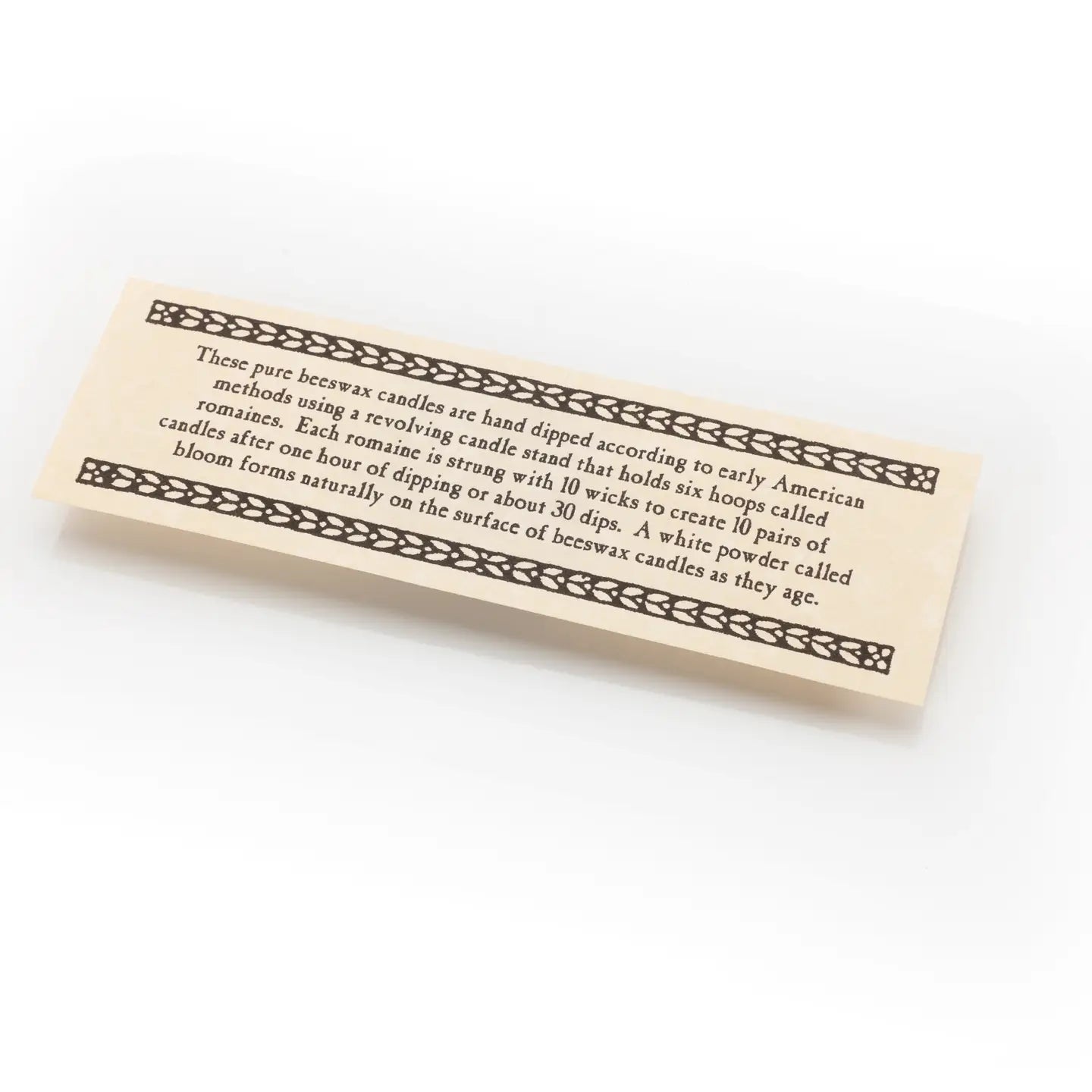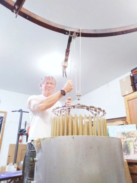 Description: These pure beeswax candles are hand dipped according to early American methods, using a revolving candle stand that holds 6 hoops called romaines. Each romaine is strung with 10 braided wicks and dipped 30 times to create 10 pairs of candles.