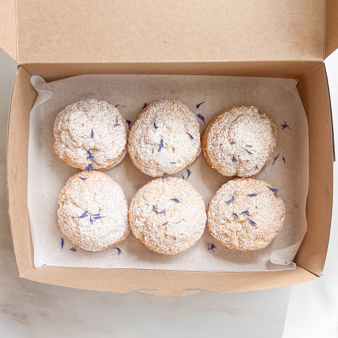 A cheerful lemon and lavender scone, dusted with powdered sugar and cornflowers.