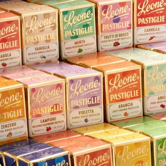 Leone confectionery company is a truly historic brand, producing their small, fragrant digestive pastiglie in Italy since 1857. Staring with the 3 original flavours: mint, cinnamon, and clove, Leone now makes a wide array of flavourful varieties of their classic confection, packaged in their classic ornate packaging, and continues to be the best selling brand of pastiglie in Italy.